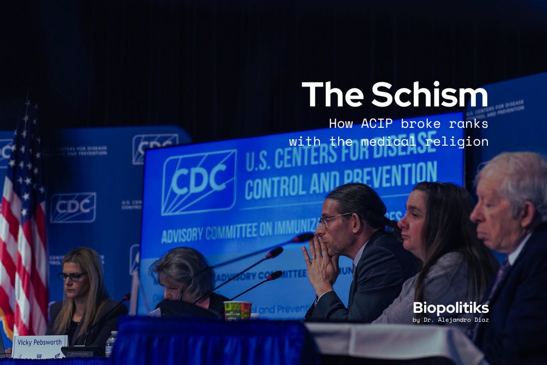 Vaccination has functioned as the ultimate catechistic ritual of modern medicine, a symbol of moral conformity. Within this framework, ACIP had served as the gatekeeper of doctrine, equivalent to a sort of synodal council for the Global Medical Religion, defining orthodoxy as a central interpreter of belief and practice in vaccinology.